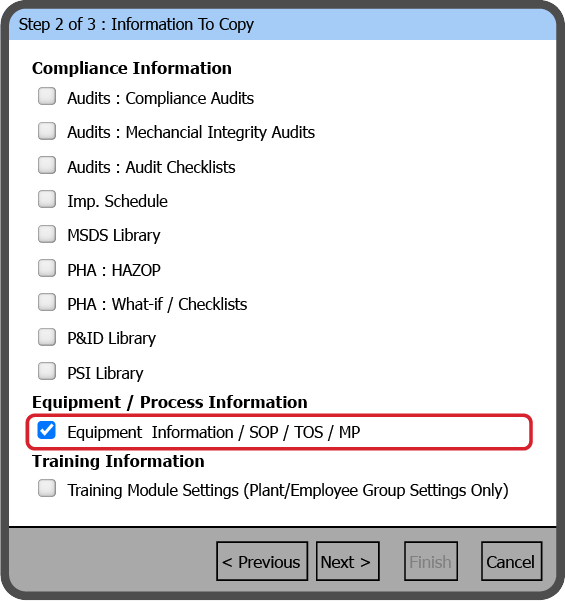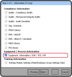 The Equipment / SOP / TOS / MP will copy all Equipment, SOPs, TOSs and Maintenance Procedures from the Source Plant. You can't make individual selections for this process.