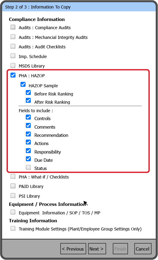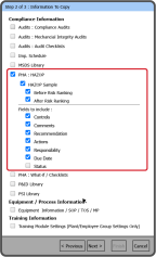 The PHA : HAZOP will list all the HAZOPs in the Source Plant. You need to select all of the HAZOPs you want to copy. When you select a HAZOP, you can choose to include the Before and After Risk Ranking entries. You can also specify which field data to copy (this applies to all of the HAZOPs you select).