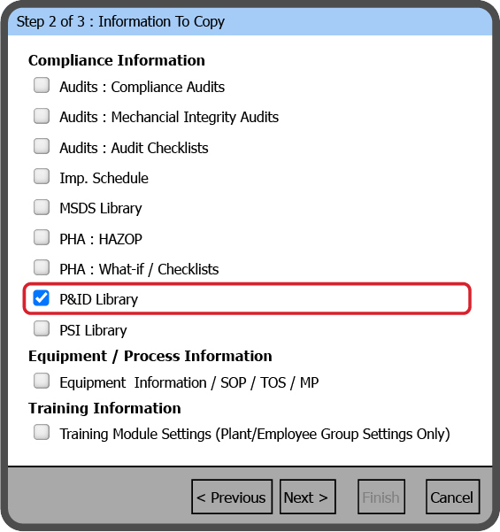 The P&ID Library will copy the entire contents of the P&ID Library from the Source Plant. You can't select individual files from the P&ID Library.