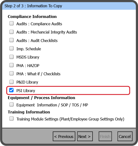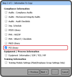 The PSI Library will copy the entire contents of the Process Safety Information Library from the Source Plant. You can't select individual files from the PSI Library .