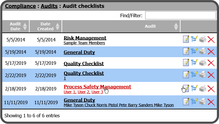 To open an Audit Checklist, select the underlined Audit Checklist Title or the Edit Icon