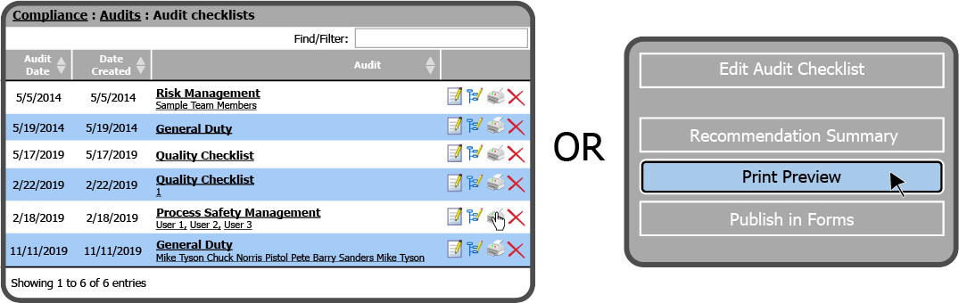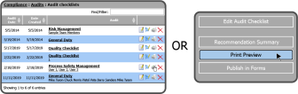 To view an Audit Checklist Print Preview, select either the Printer Icon (to the right of the Audit Checklist) or the Print Preview Button