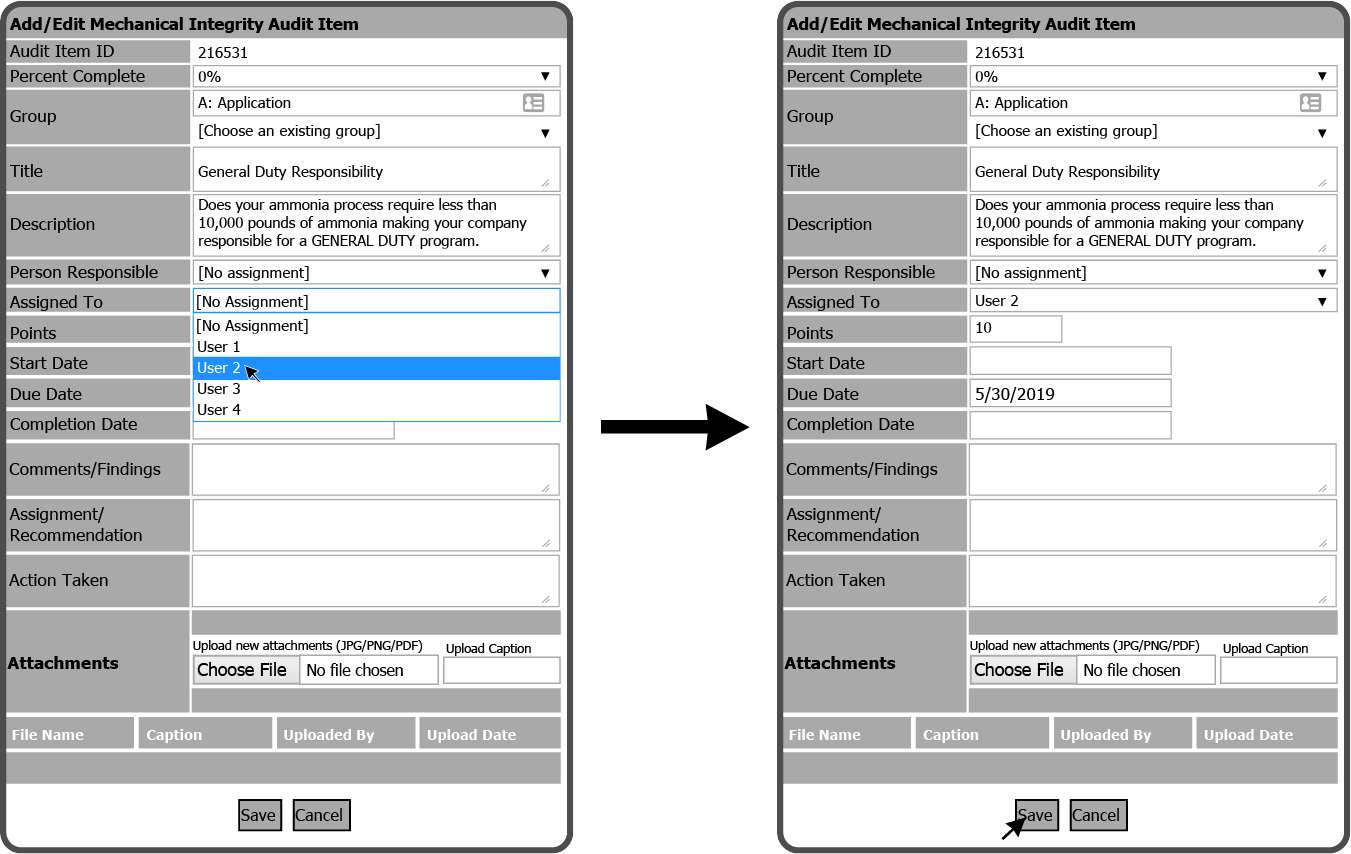 Next to the Assigned To field select and scroll to the person you want to assign the Item to. Then select the Save Button