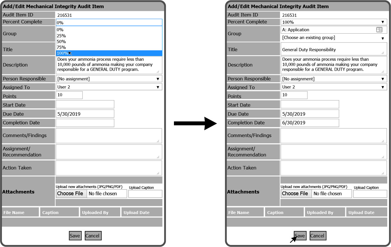 Note: If you change the Percent Complete field 100% and don't fill in a Completion Date, the System will automatically enter the current date.
