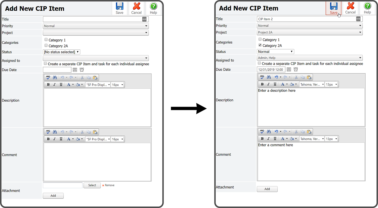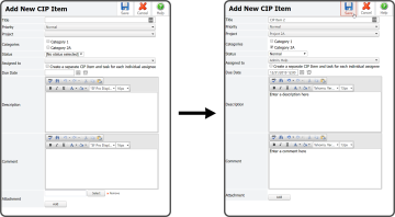 Both options open the Add New CIP Item page. Enter a Title, select a Priority, select a Project, select Category(s) (optional), select a Status, select who the Item is Assigned To, enter a Due Date, enter a Description (optional), enter a Comment (optional), add Attachment(s) (optional), and select the Save Icon