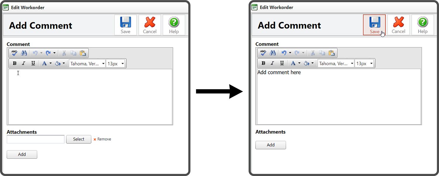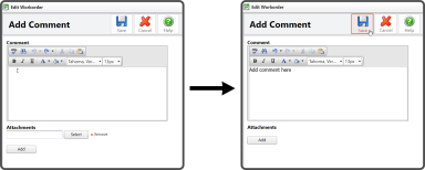 This will open the Add Comment window. Enter a Comment, add an Attachment (optional), and select the Save Icon