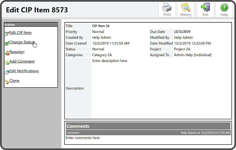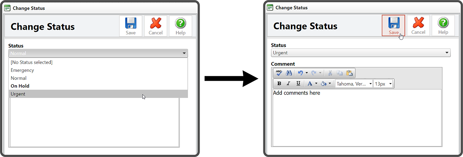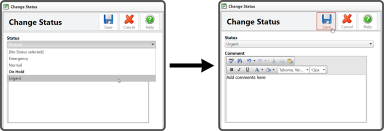 This will open the Change Status window. Change the Status, add Comments (optional), and select the Save Icon