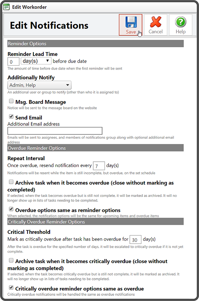 This will open the Edit Notifications window. Make the needed changes and select the Save Icon