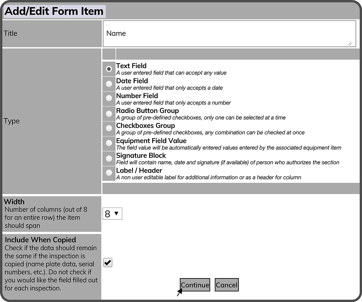 Note: For the "Include When Copied" Field, check the box if the data should remain the same if the Form is copied (name plate data, serial numbers, etc.). Do not check if you would like the field filled out for each Form.