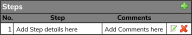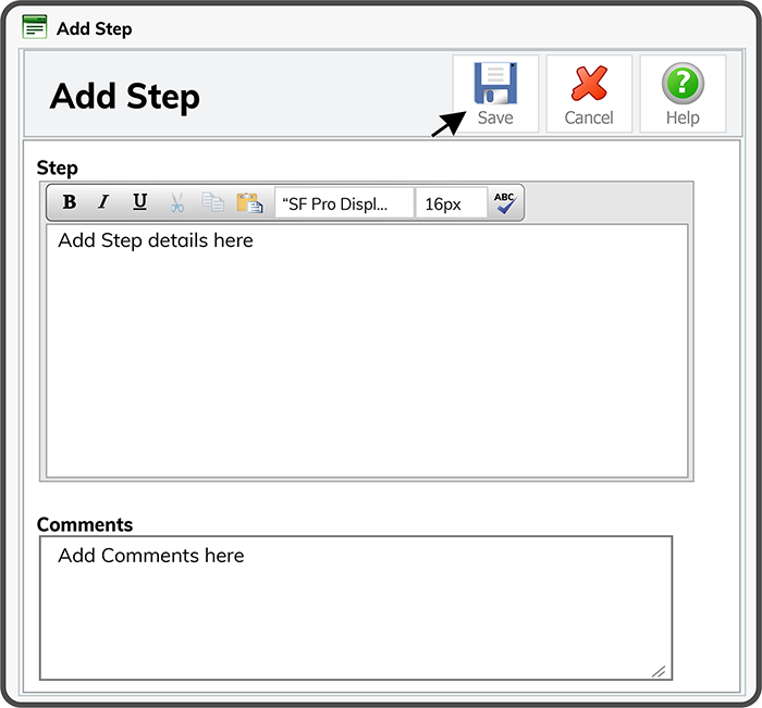 This will open the Add Step window. Add Step details, Comments (if needed), and select the Save Icon .